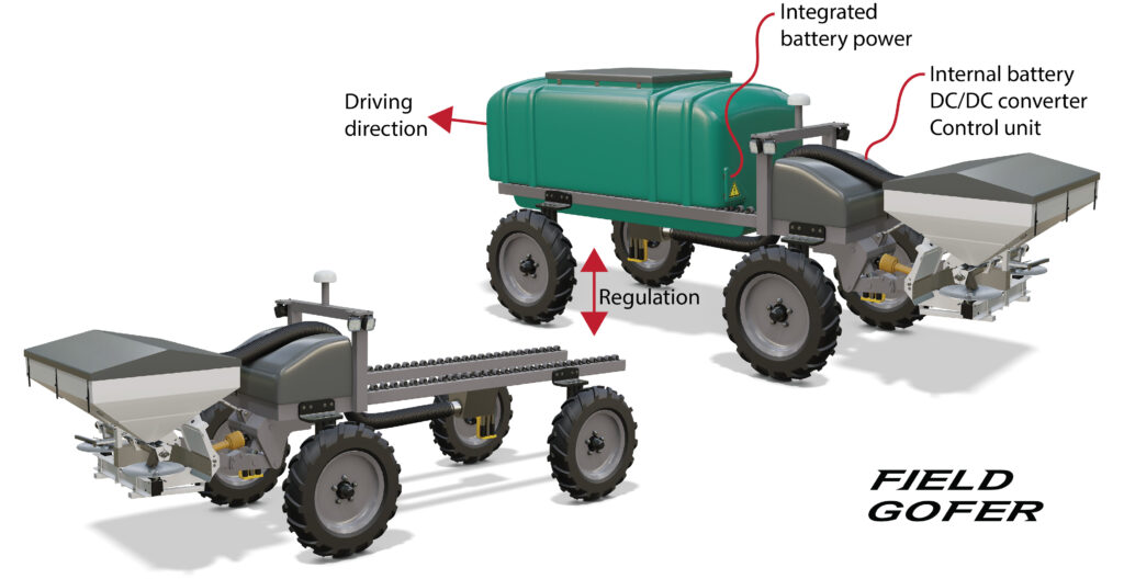 The patented Fieldgofer Concept and the patent-pending Nonstop Battery Concept (NBC) are Swedish inventions that may revolutionize the way electric agricultural machinery is powered. NBC is an electric drive system for agricultural machines that handle loads such as fertilizer, grain, seed, or water. The concept is based on separated battery capacity, where the primary energy source is integrated into interchangeable load carriers (e.g., tanks or containers). NBC eliminates the need for time-consuming charging (or battery changing) stops in the field.